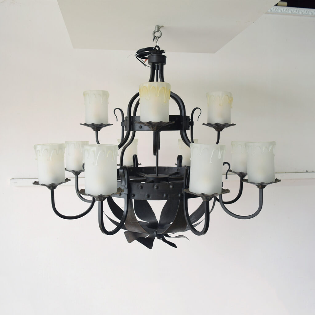 力強くクラシカルな印象を与える、アイアン製の大型シャンデリア。
