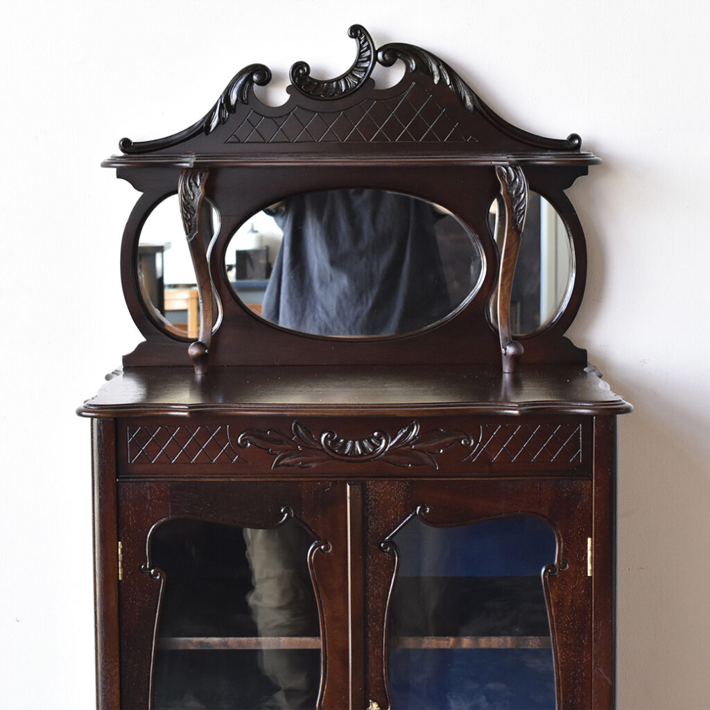 さらに上部には小さな飾り棚とミラーが設けられ、実用性と装飾性を兼ね備える点も当時の家具様式の特徴をよく表しています。