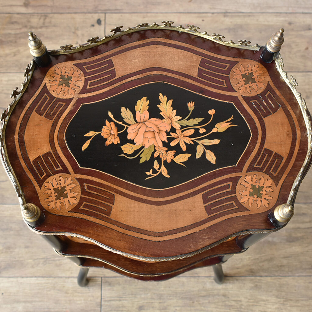 本品は三段構造で天板部分には花の象嵌が施され、細やかな意匠が空間に華やぎを添えます。