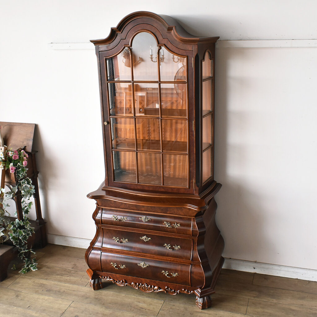 上部のガラス扉はアーチを描いた優雅なクラウンデザインが印象的で、内部の棚に飾られるコレクションや書籍をまるで額縁のように美しく引き立ててくれます。