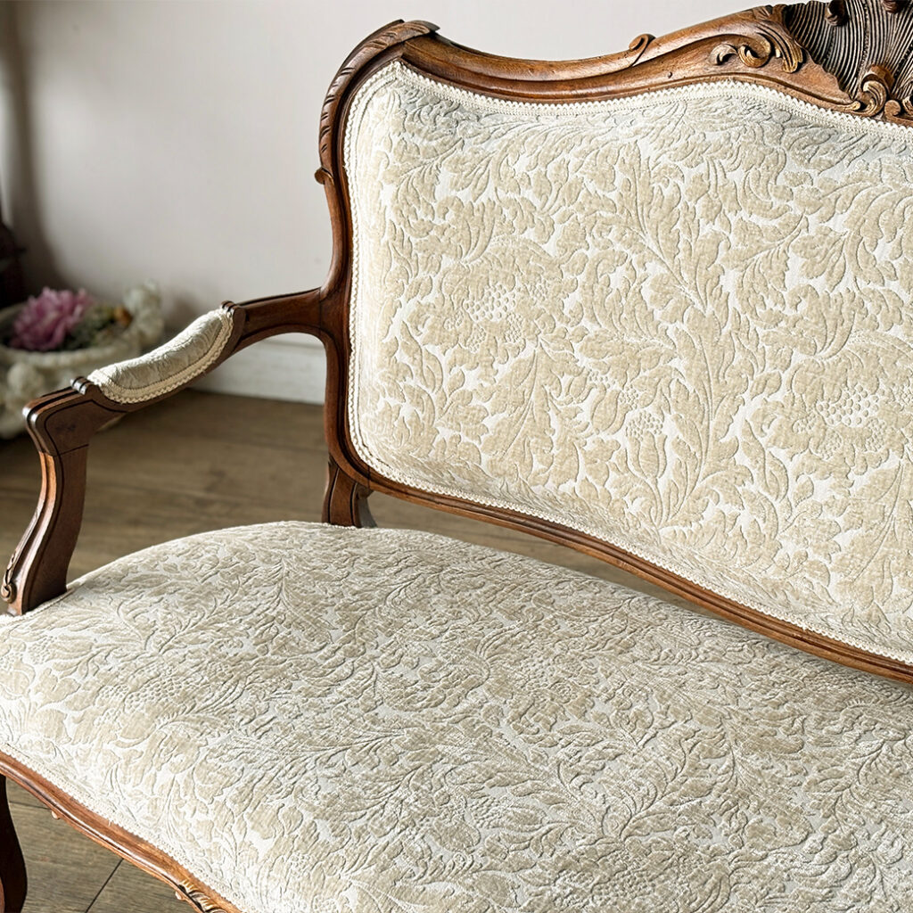 気品漂うロココ調の優雅なデザインが目を引くウォールナット材のツーシータソファ。