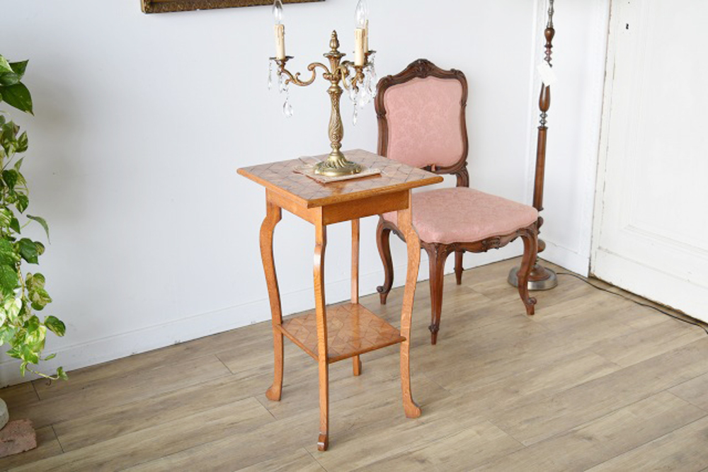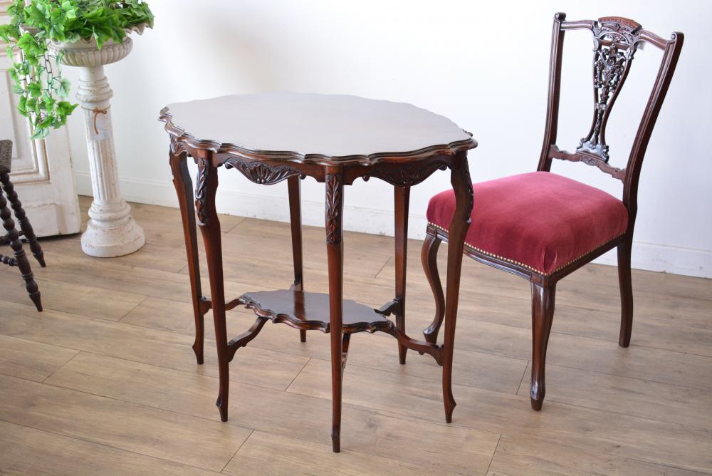 すらっとしたシンプルなデザインのマホガニーテーブル。一見そんな風には見えませんが100年以上歴史を重ねたテーブルなんです。作られたのはイギリスのエドワーディアン期という、直線的でシンプルなデザインが好まれた時代。そんな遠い時代に作られたこちらのテーブルですが、入荷時は天板が乾燥によるひび割れで何ヶ所かパッカリと割れた状態でした。