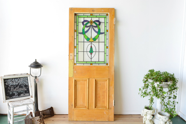 一番に目を惹くのはシンメトリーでお洒落なステンドグラスですよね。ブルーやグリーンと言った寒色で彩られた、落ち着きのあるデザインです。そこに無着色のカントリーなドアがマッチしていますね。もちろんお好きな色に塗装していただくことも可能です。