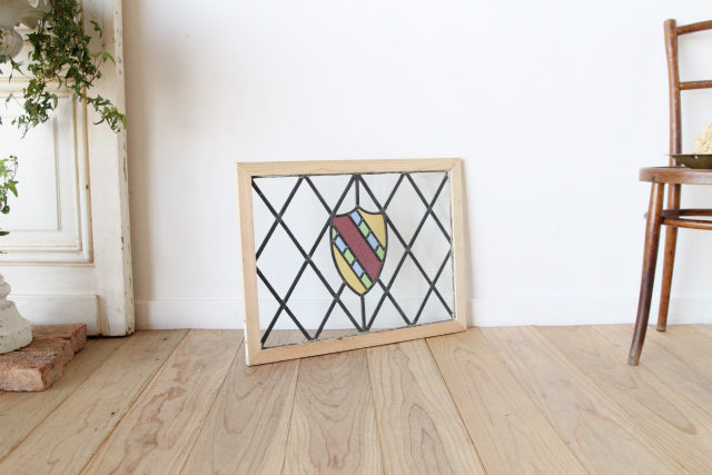 紫に緑に青に黄色とカラフルなモチーフが使われたステンドグラスです。中央のモチーフ以外は全てクリアガラスですので、向こう側がはっきりと見えます。シンプルなデザインですが斜め格子状のケームが可愛らしい雰囲気を出してくれています。