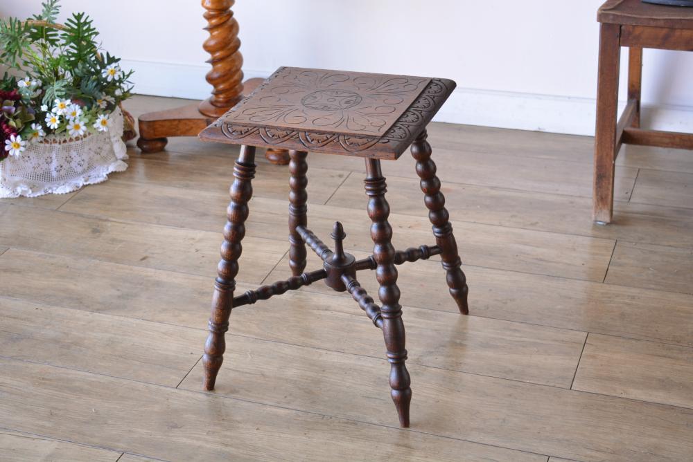 フラットな天板部分が小さいことから察するに、実用としてのテーブルではなく花台などとしての装飾テーブルの役割を大きく担っていたのでしょう。見て下さい…この見事なまでの彫刻装飾…。天板に至っては中央以外は全てが彫刻に覆われています。一枚の木から彫り抜かれたとは思えない程の繊細で緻密な彫刻…。よく見るとお分かり頂けると思うのですが、丸いお花のレリーフ彫刻は内部が空洞になっているのがお分かり頂けるでしょうか。なんとお花の内部まで透かし彫りにされているんです…どうやってここまで繊細なものを透かし彫りにしているのでしょう…。この天板一枚とってみても、どれだけの時間と技術を費やして製作されたのか…気が遠くなる作業です。