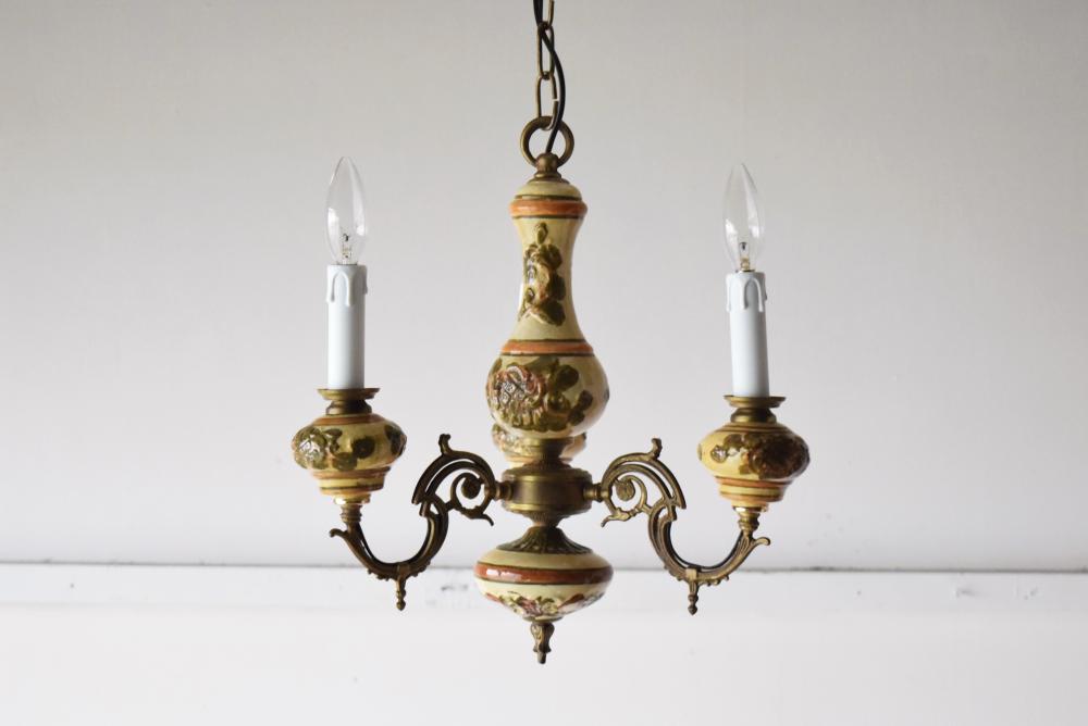 フランスらしい華やかなシャンデリアです。真鍮装飾は植物を模したデザインで統一されています。線が細いので曲線美が良くわかります。多くのシャンデリアは中心に【芯】があり、そこに配線を通しています。しかしこのシャンデリアは中心部分が空洞で3本の柱で支えられています。3本の柱それぞれに配線することで線の細さを表現しています。