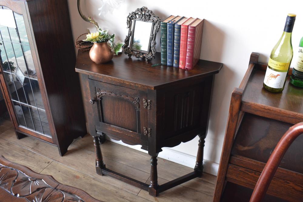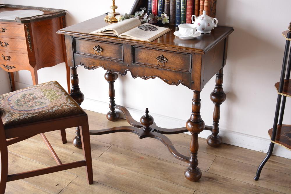 イギリス・ゴシックスタイルを1930年代のアールデコ時代らしくすっきりとリデザインしたコンソール。天板・本体はもちろんのこと、表からは見えないような引き出し・内部構造そのすべてがオークの無垢材で出来ている贅沢な逸品です。見えない部分にはコストや作業のしやすさを優先してそこまで良い材を使用していないのが常ですが、こちらのコンソールテーブルはことごとくオーク無垢材を使っているあたり今では考えられない豪華さです…。