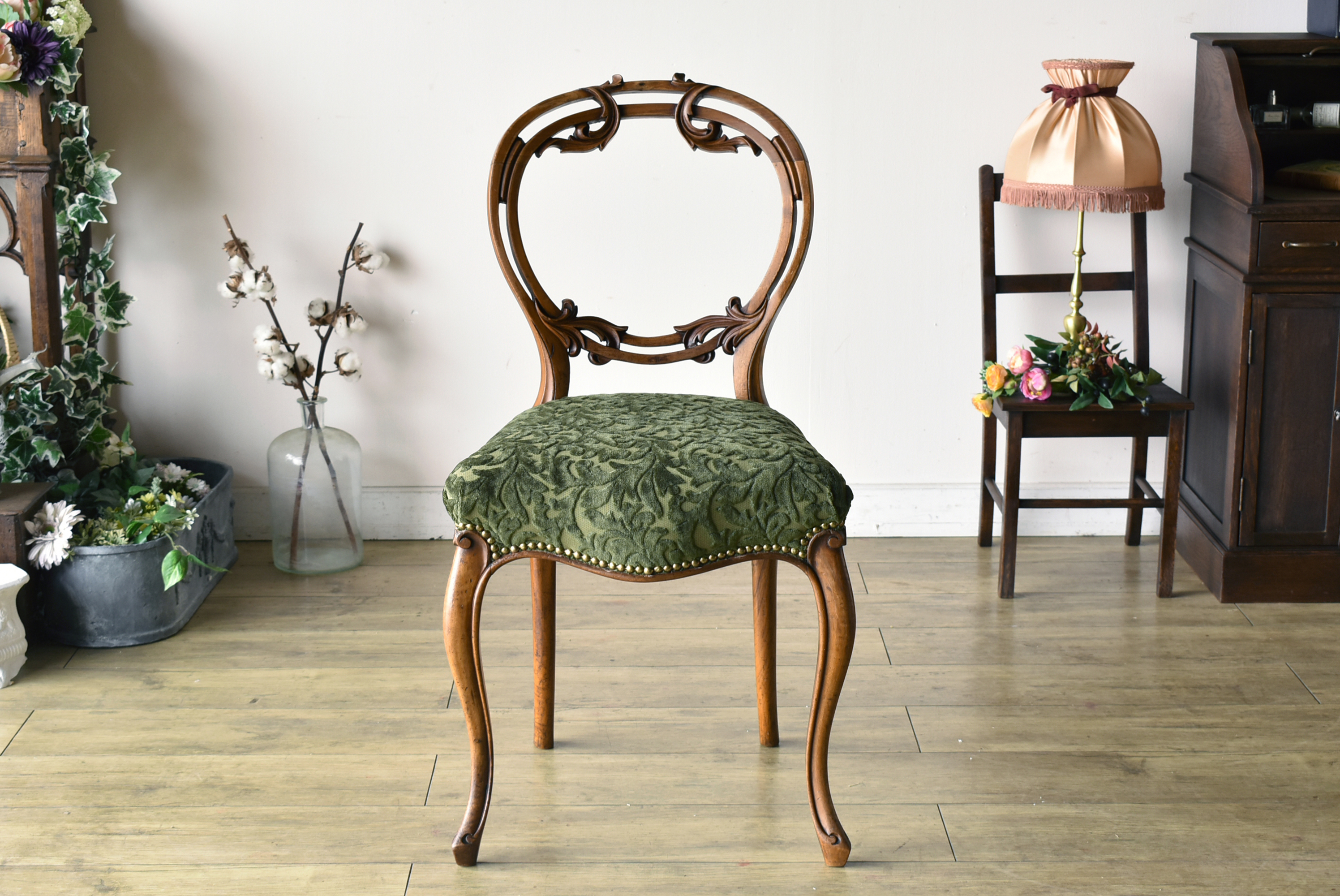 字の通り風船のように丸い形の背を持つことから“バルーンチェア”と呼ばれるこのチェア。ヴィクトリアンの時代から作られ始めたといわれています。豪華で繊細な彫刻、優雅なガブリオールレッグ…まさに社交界の象徴とも呼べそうなチェアですね。貴婦人たちが腰かけておしゃべりしている様子が浮かびます。