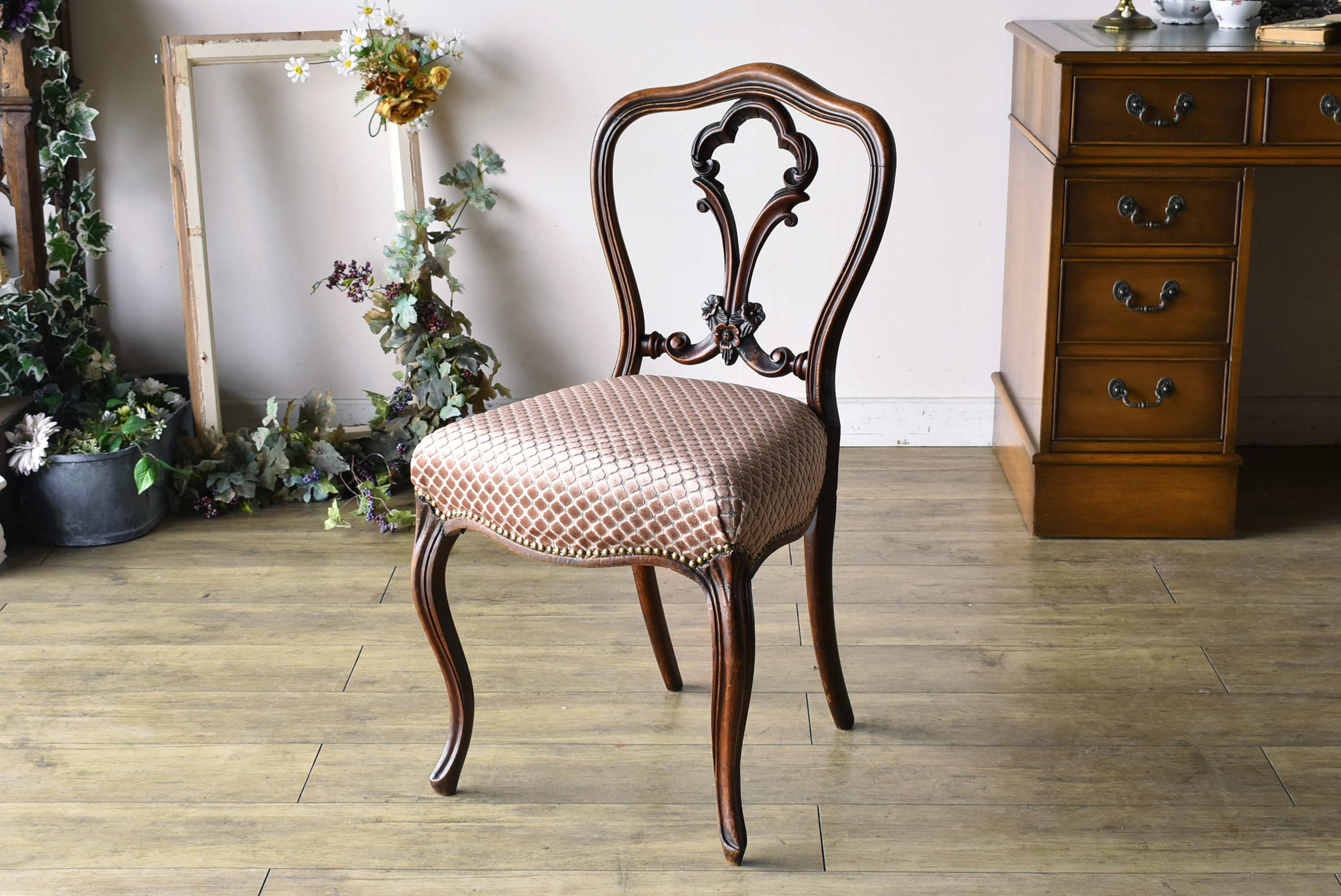 見た目の美しさだけでなく、実用性も十分。ダイニングチェアやドレッサーチェア、デスクチェアとしてはもちろん、店舗什器やディスプレイ用のアクセント家具としても活躍します。イギリスアンティークチェア/バルーンチェア/1890年代ヴィクトリアン家具/ウォールナット無垢材/アンティーク椅子をお探しの方におすすめの一点物です。