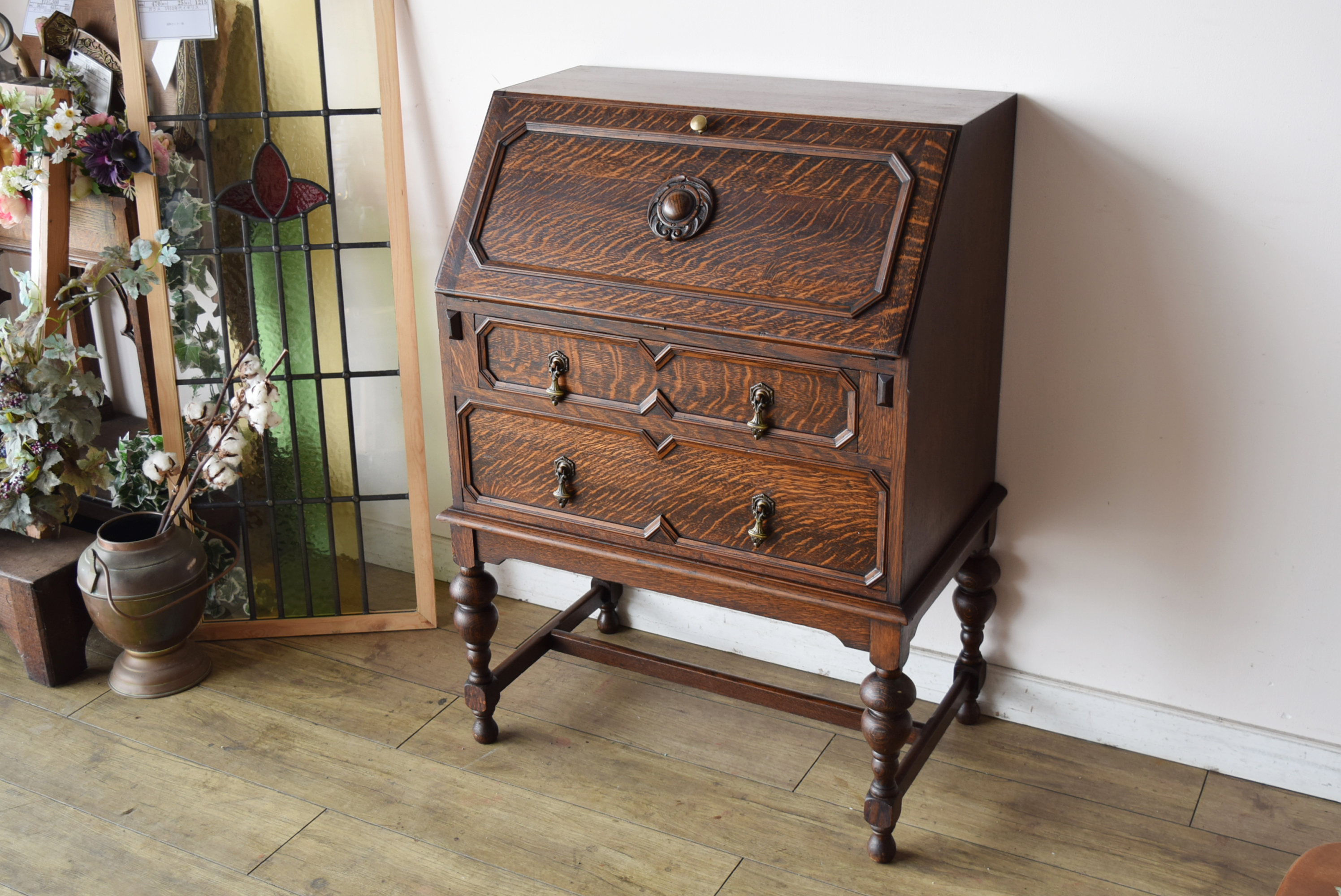 気品ある佇まいが魅力の1920年代イギリス製アンティークレザートップテーブル。テーブルと言いましたが、デスクともチェストともいえるとても珍しいデザインであまり見たことのない形をしています。重厚なマホガニー材を使用し、天板には深みのあるワインレッドのレザーがあしらわれておりゴールドの型押し装飾が上品なアクセントとなりデスクとしての風格を一層引き立てます。天板レザーはダメージがほとんどありませんでしたのでクリーニングをしてそのまま使用しています。