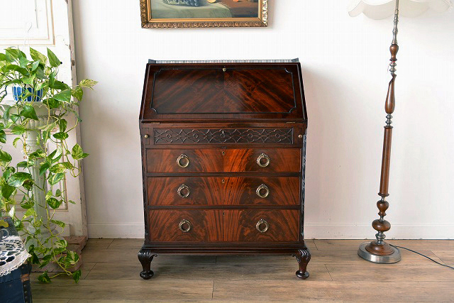 ダークオークで濃い色合いがイギリス・アールデコ調のシンプルなデザインをシックにまとめており、クイーンアンを取り入れたすらっとした美しいフォルムのカブリオールレッグが目を引きます。上部開きを開くと書き物が出来るライティングビューローとしてお使い頂けます。上部を開く際は、すぐ下にある棒を引き出して支えにしてお使いください。なお鍵は付属しておりません。お届けの際は鍵穴部分に真鍮つまみを取り付けてお届けします。