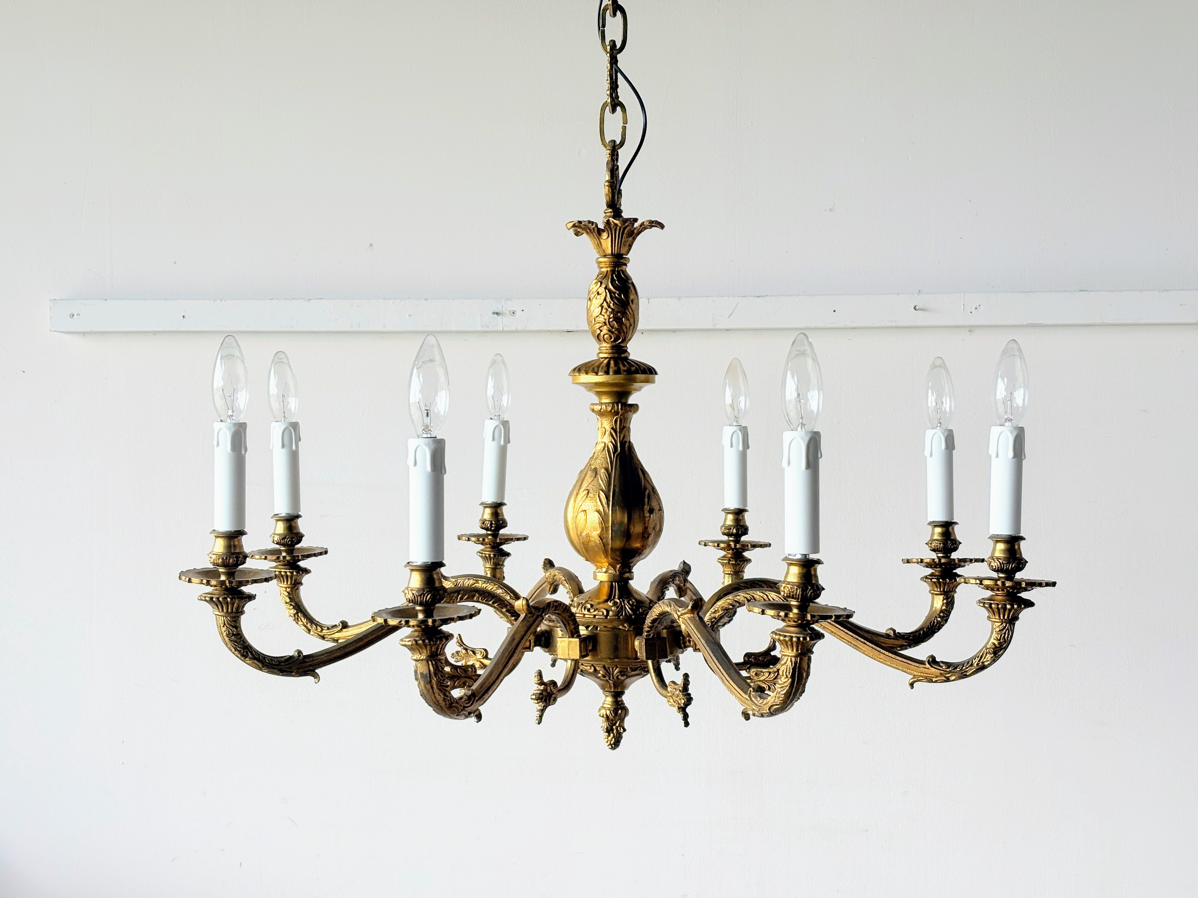 空間を一瞬でエレガントな装いに変貌させる、圧倒的な存在感を放つ8灯式ガラスシャンデリアです。フレームには重厚感のある真鍮を贅沢に使用。時を経たような深い色合いと、細部まで丁寧に施された彫刻細工が、クラシカルで洗練された雰囲気を醸し出します。